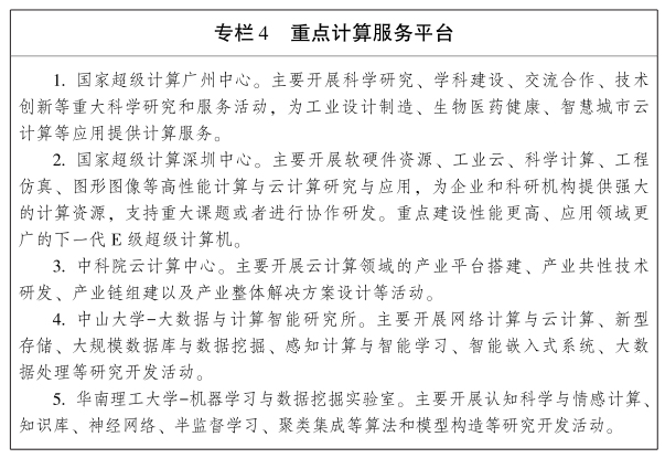 (二)推进深度学习计算服务平台建设。依托国家超级计算广州中心、国家超级计算深圳中心,加快建设一批深度学习计算服务平台,强化对超级计算、交互式计算等高性能计算研究,为深度神经网络模型训练、气象预报、基因测序等提供强大计算支持。发挥中国科学院云计算产业技术创新与育成中心、中国电信广州云计算数据中心、深圳大学城云计算公共服务平台等大型云计算服务平台作用,强化算法和技术研究,为高校、企业等开展研发创新活动提供数据存储、算法服务和整体解决方案。鼓励中山大学、华南理工大学、广东工业大学、广东省智能机器人研究院等高校院所建设面向深度学习的人工智能公共计算平台,强化对人工智能基础理论、算法及大数据处理等方面的研究,搭建满足重点场景的计算集群。