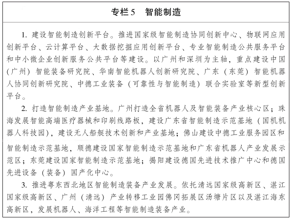 1.智能机器人。推动人工智能、互联网、物联网等技术在机器人领域的深入应用,提升机器人产品智能化水平。大力发展智能服务机器人,以智能感知、模式识别、智能分析和智能决策为重点,推进教育娱乐、医疗康复、养老陪护等特定应用场景的智能服务机器人研发及产业化。推进工业机器人智能化升级,以机器视觉、自主决策为突破方向,重点开发搬运、检测、装配、喷涂、打磨、焊接、码垛等领域的智能工业机器人,实现高危险、高洁净度等特定生产场景的快速响应,全面提升工业机器人控制、传感、协作和决策性能。选择装备制造、电子信息、包装印刷等广东优势产业领域,推动智能工业机器人应用示范。