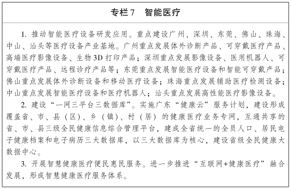 10.智能医疗。利用人工智能核心技术,推动人工智能治疗新模式创新,建立快速精准的智能医疗体系。支持中山大学、南方医科大学的附属医院以及广东省人民医院等高水平三甲医院加快建立和完善人工智能辅助诊疗中心,推行智能语义电子病历系统,推动医疗设备与智能技术相融合,重点开发数字化医疗影像设备、分析系统、诊断系统、健康检测系统等智能医疗设备。探索智慧医院建设,研发智能诊疗、智能多学科会诊等。建设广东健康医疗业务专网、全民健康信息综合管理平台和省级全民健康大数据中心。