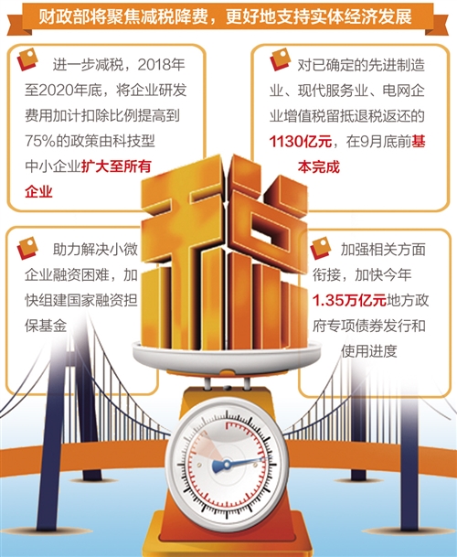 据介绍,2018年至2020年底,将企业研发费用加计扣除比例提高到75%的政策由科技型中小企业扩大至所有企业,初步测算全年可减税650亿元。此外,对已确定的先进制造业、现代服务业、电网企业增值税留抵退税返还的1130亿元,在9月底前基本完成,以尽快释放政策红利。