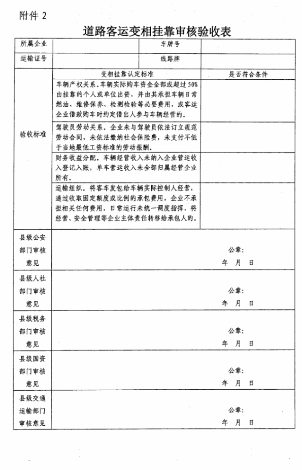 1.车辆产权关系。车辆实际购车资金全部或超过50%由挂靠的个人或单位出资,并由其承担车辆日常燃油、维修保养、检测检验等必要费用,或客运企业借款购车时约定借出人参与车辆经营的(责任单位:交通运输局牵头,公安局、国资办)。