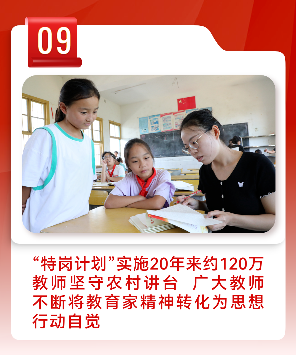 在第41个教师节来临之际,习近平总书记回信勉励全国特岗教师代表,不断提高教书育人本领,用心用情呵护引导孩子们健康成长,努力培养出更多德智体美劳全面发展的社会主义建设者和接班人。“特岗计划”实施20年来,累计选聘特岗教师约120万人,覆盖中西部22个省份、1000多个县的3万多所农村学校。一年来,教育系统以大力弘扬教育家精神为引领,着力造就一支高素质专业化教师队伍。弘扬践行教育家精神,实施教育家精神铸魂强师行动,在全国范围开展教育家精神巡回宣讲,发布2025年全国“最美教师”。从严从实建设师德师风,出台新时代师德师风建设长效机制的意见。出台《教育部等六部门关于加强新时代高校青年教师队伍建设的指导意见》,支持青年教师全面成长。大力提升教师教书育人能力,开展教师教育创新机制改革试点,联合国家发展改革委启动“教师教育能力提升工程”,布局建设一批高水平教师教育师范院校;2025年首批“国优计划”毕业生走上中小学教师岗位,中西部迎来近万名“优师计划”首届毕业生;深入实施“三区”人才支持计划、教师专项计划、银龄讲学计划等支教项目,缓解乡村优秀教师紧缺的状况,推动教育优质均衡发展;启动实施“数字化赋能教师发展行动”,发布《教师生成式人工智能应用指引》,全面提高教师数字素养和人工智能素养。出台普通本科高校产业兼职教师管理办法,推进人才培养与产业技术创新深度融合。巩固提升教师待遇保障,推进实施乡村教师生活补助,实现教龄津贴40年来首次提标,会同有关部门首次构建“配租+配售”相结合的乡村教师住房保障体系;出台八条举措进一步减轻中小学教师非教育教学负担,创设潜心教书、静心育人良好环境。
