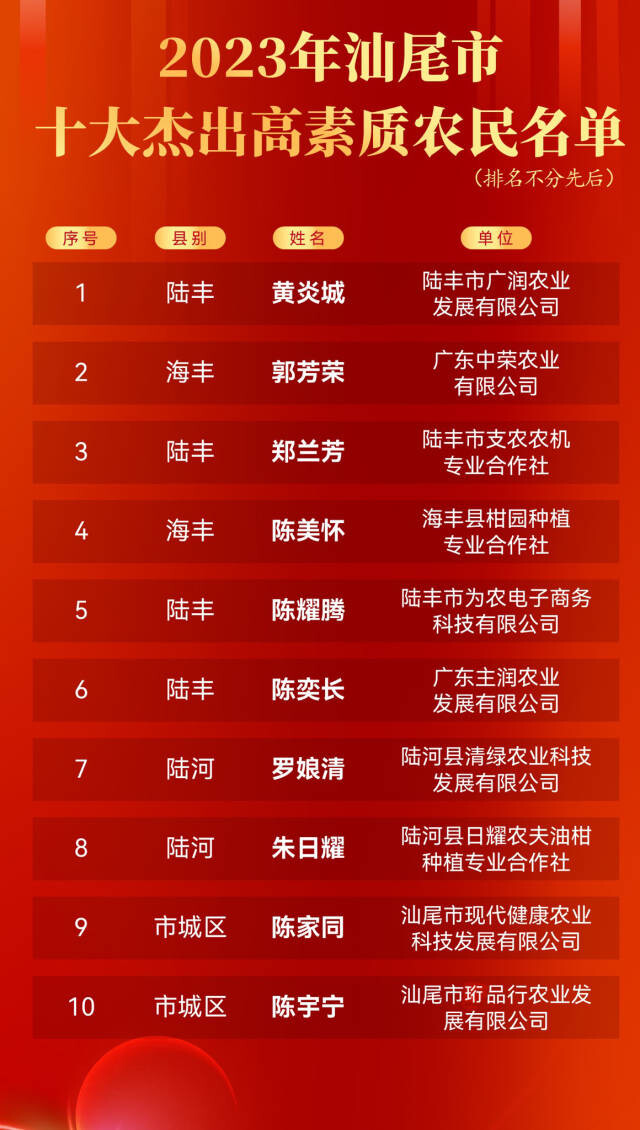 据悉,十名高素质农民来自汕尾各地,有60后、70后、80后,有跨行投身农业不久的青年才俊,也有几十年如一日从事农业的长者,他们都拥有着三农事业初心,牢记着三农事业使命,在百万农民中脱颖而出,成为我市高素质农民杰出代表。