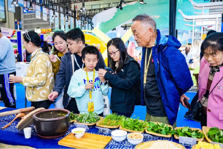 到了汕尾,陆河擂茶是不容错过的传统名点。展区内工作人员现场展示擂茶制作过程,将滚烫开水冲入擂制好的茶泥中,再加入炒米、花生等配料,一碗碗油茶香气逼人。新奇的食用方式抓住了众多外省游客的眼球,他们纷纷发出感叹,“第一次知道茶叶还能这样吃,口感很奇妙。”