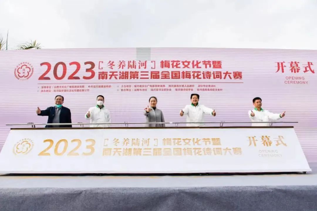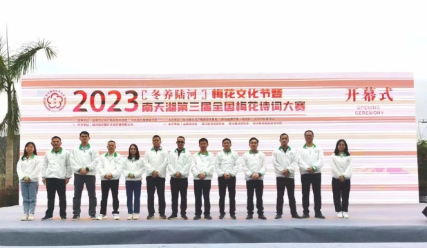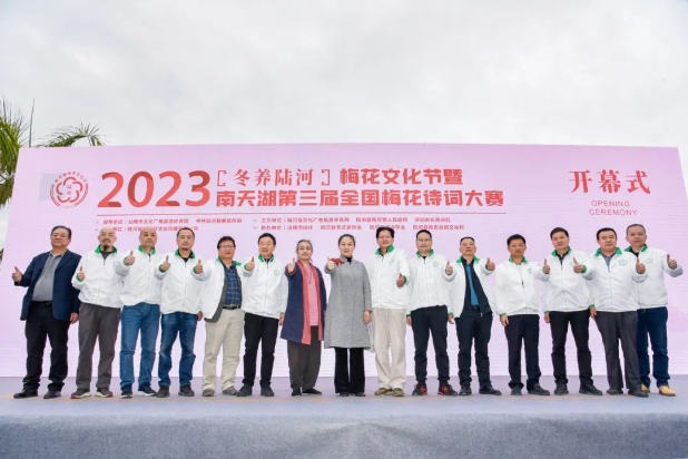 县委常委 宣传部长曾玮玮、中华诗词学会城镇工作委员会副主任 深圳长青诗社社长高源、陆河县文广旅体局局长游永健、陆河县南万镇人民政府镇长刘圣宾、陆河县委宣传部副部长欧阳碧绸、广东省中华诗词学会常务理事 深圳长青诗社党支部书记周兴海、惠州市诗词楹联学会常务副会长李硕洪、陆河县文广旅体局副局长刘德森、陆河县文广旅体局副局长彭永城、中科博士后 核电设计总工程师 深圳长青诗社副社长姜晓玮、深圳市报业集团出版社副总编辑 深圳长青诗社副社长刘万专,以及南万镇领导班子成员等出席了本次活动,共同庆祝2023年“冬养陆河”梅花文化节暨南天湖第三届全国梅花诗词大赛启动仪式。