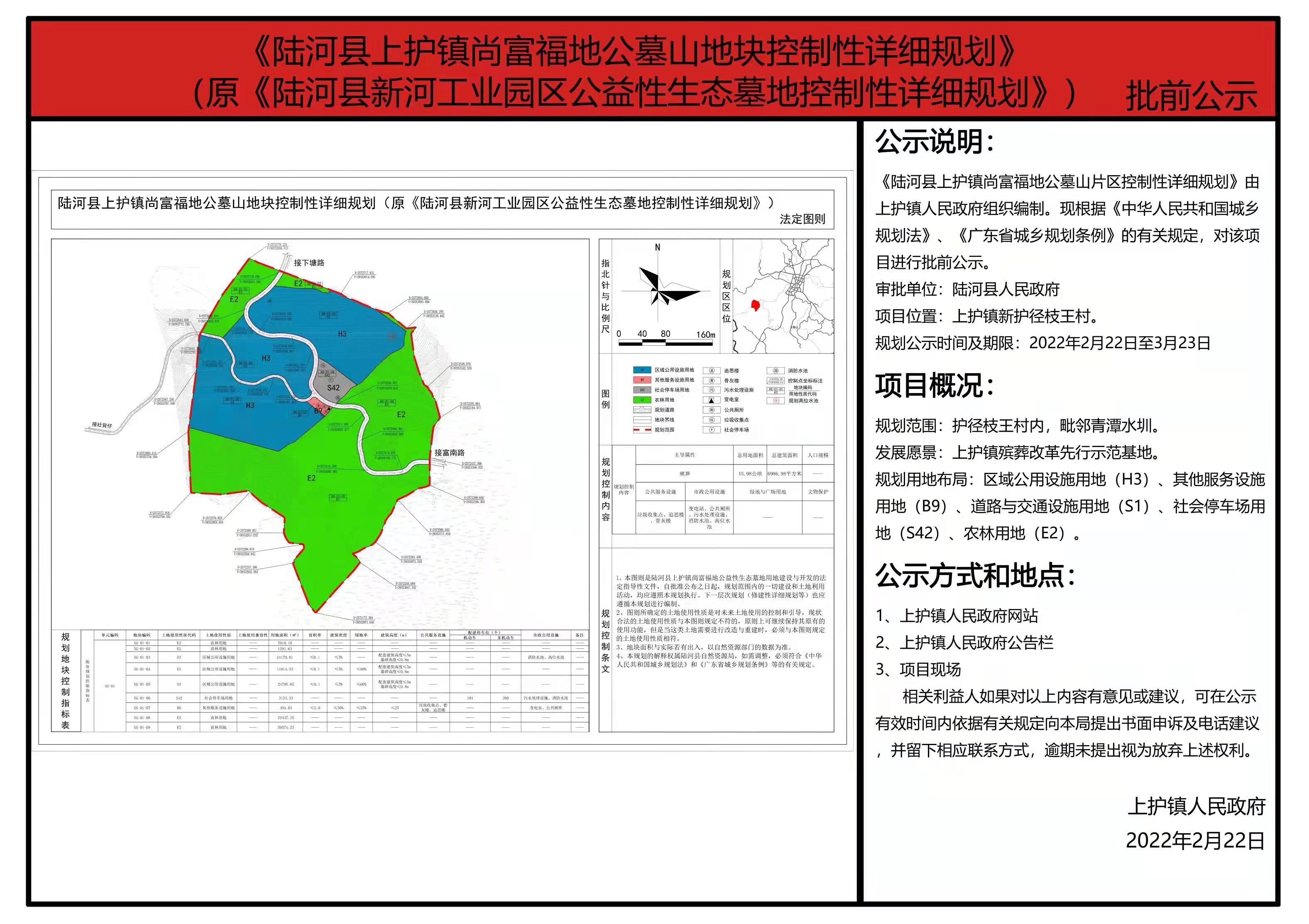《陆河县上护镇尚富福地公墓山地块控制性详细规划》(原《陆河县新河工业园区公益性生态墓地控制性详细规划》)批前公示