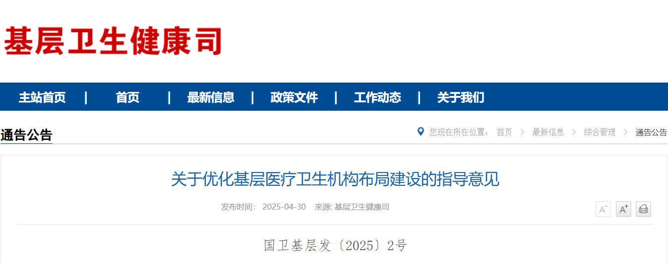 2023年初,中共中央办公厅、国务院办公厅印发《关于进一步完善医疗卫生服务体系的意见》和《关于进一步深化改革促进乡村医疗卫生体系健康发展的意见》,要求根据人口分布情况,优化设置社区卫生服务站和村卫生室,因地制宜合理配置乡村两级医疗资源。2025年1月17日国务院常务会议听取优化基层医疗卫生机构布局建设情况的汇报,中央经济工作会议提出实施医疗卫生强基工程。为落实中央文件要求和国务院常务会议部署,国家卫生健康委会同相关部门研究制定了《关于优化基层医疗卫生机构布局建设的指导意见》,为实施医疗卫生强基工程和谋划编制“十五五”规划提供依据,指导各地结合实际,把基层医疗卫生机构布局好、建设好、使用好。