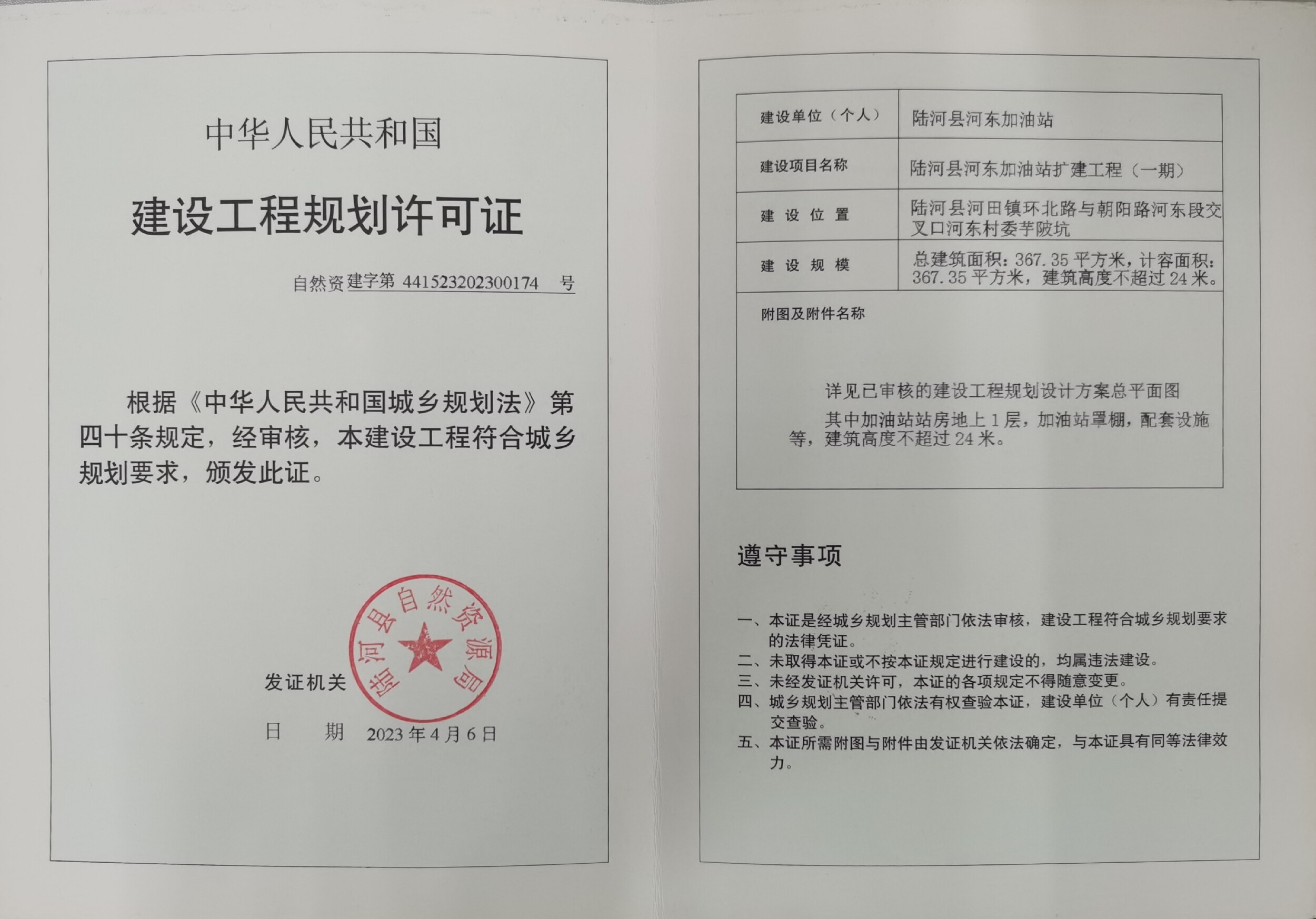 2023年3月,陆河县河东加油站向我局申请办理建设工程规划许可事项,已于2023年4月6日办理完结。依照《广东省城乡规划条例》第三十一条的有关规定,现对相关事项公告如下:
