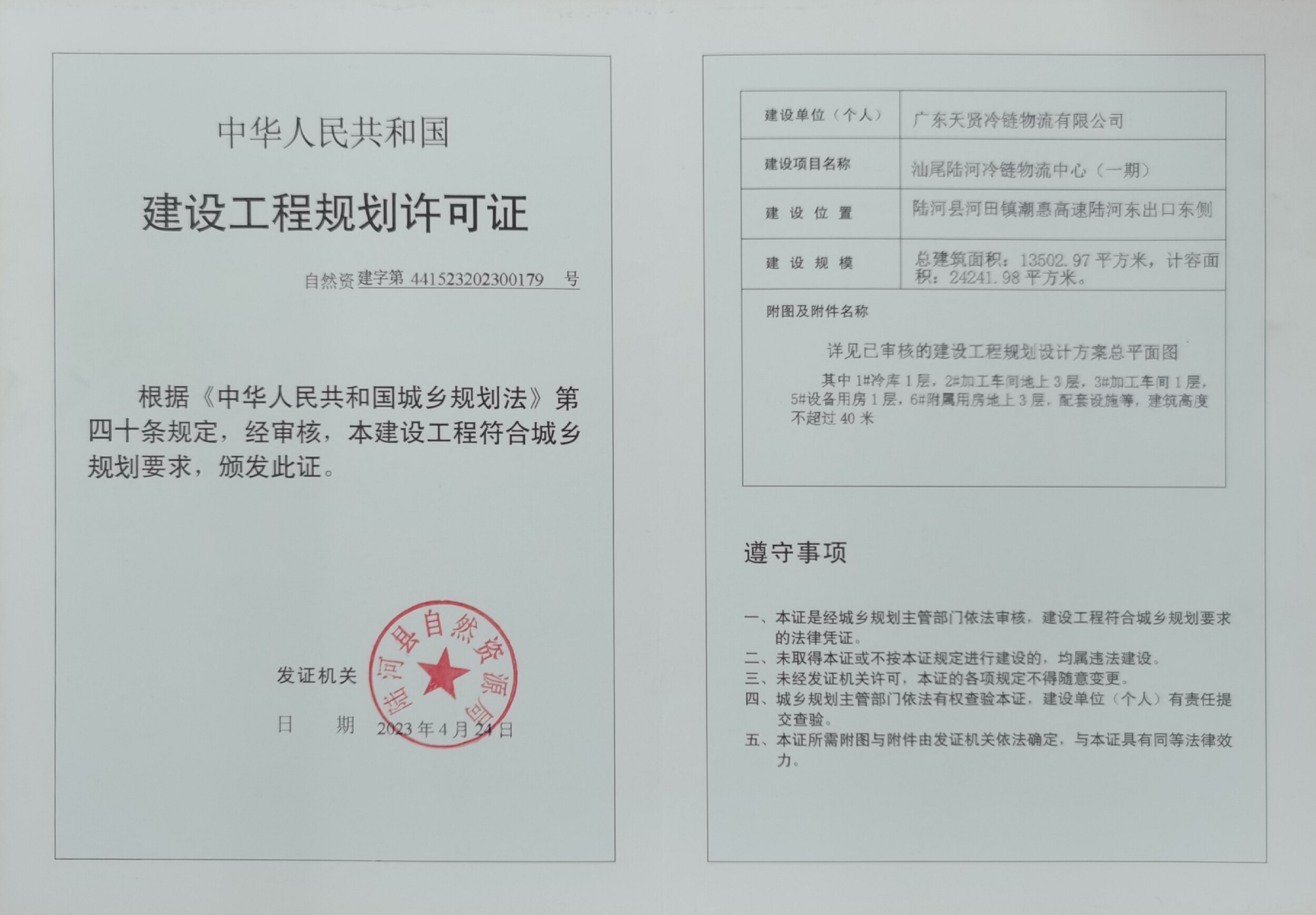 《建设工程规划许可证》证号:自然资建字第441523202300179号